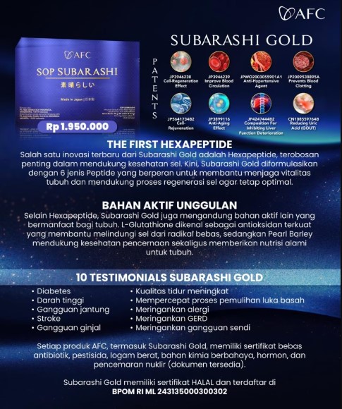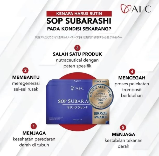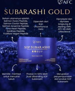 Manfaat Subarashi SOP Subarashi adalah salah satu suplemen kesehatan unggulan yang diproduksi oleh AFC Japan Official. Produk ini mengandung Salmon Ovary Peptide (SOP), bahan alami yang telah